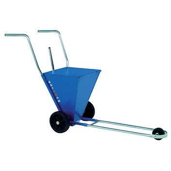 Carretilla para marcar campos equipada de cepillo difusor y cierre manual del surtidor. Depósito para la cal de gran capacidad provisto de tapa. Estructura metálica termolacada epoxi y electrozincada en mangos y horquilla delantera