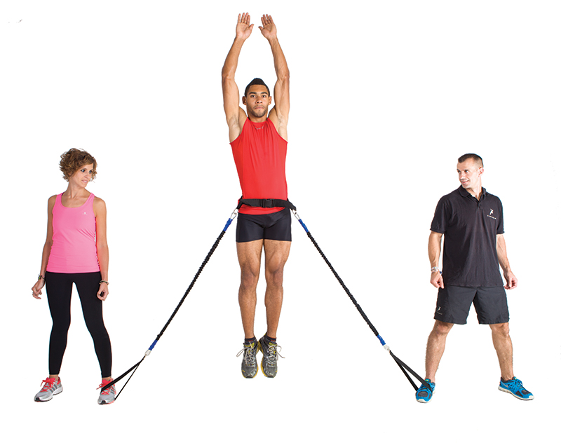 Cinturón de potencia de salto. Cinturón con dos gomas para anclar mediante un punto fijo al suelo o sujetarlo por 2 compañeros. Para trabajar la potencia de salto vertical y diagonal.