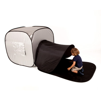 La cueva es un playpen robusto, portátil que se puede plegar cuando no se vaya a utilizar. Dentro se puede percibir una total oscuridad, ideal para realizar juegos de estimulación sensorial, percepción, etc. Medidas: 1x1x1 mts cueva. Túnel de 1,5 mts. Diámetro de entreda 48 cm.