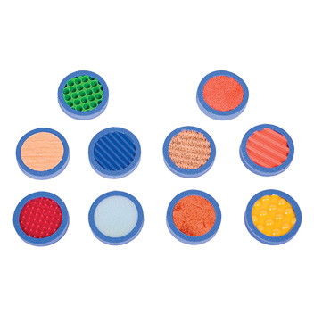 Complemento de las sensaciones plantares. Discos con 10 texturas diferentes. Ideales para desarrollar el sentido del tacto. Tienen las mismas texturaas que nuestras sensaciones plantares, por lo que se pueden realizar juegos de asociación, poniendo el recorrido de las sensaciones plantares para el taco con los pies y selecionanado la mini sensación plantar correspondiente mediante el tacto con las manos. Texturas: Esparto, moqueta, cerámica, madera, espuma. Texturas plástico: Pincho fino, Pincho grueso, líneas finas, Líneas gruesas, agujeros.