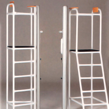Estructura metálica pintada con plataforma de contra placado de madera antideslizante. Respaldo y pequña mesa de anotaciones.