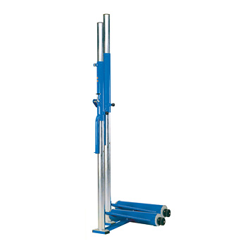 Juego de postes de voleibol graduables a 8 alturas. Tubo de acero esmaltado. 90mm diam. Altura 2,43m Sistema de tensión con torno y cierre automático. La plataforma inferior integra el contrapeso en su interior, evitando así el desgrane de los bloques de hormigón que acaban deteriorando las pistas deportivas.