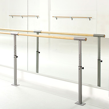 Barras con columnas idénticas a los modelos móviles pero con base de pletina preparada para su fijación con 4 tornillos al suelo. Modelo apropiado para substituir las barras de pared cuando ésta se utiliza para colocar espejos.